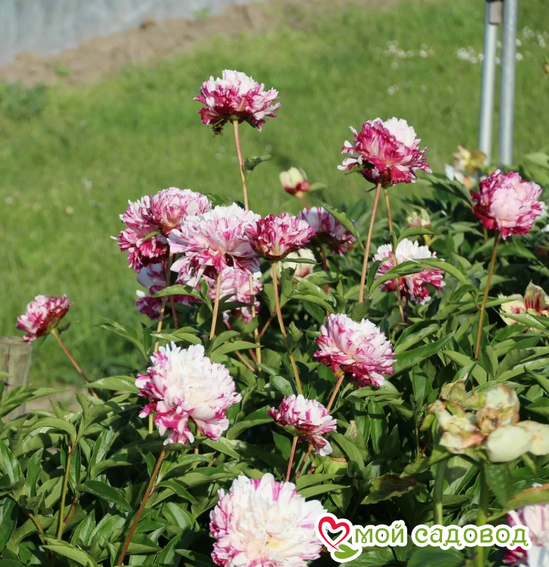Махровый шаровидный. Цветок эффектный, белый с малиново-красными полосками. Листья глянцевые, тёмно-зелёные. Высота 60-80 см. Срок цветения средне-поздний. Место посадки Для посадки пионов понадобится защищенное от ветров место с хорошей освещенностью. Сорта светлой окраски, а также пионы с простыми и полумахровыми цветками можно посадить на частично затеняемом участке, это продлит цветение и защитит цветы от выгорания. Почва для посадки Залог успешного цветения пиона в будущем — это подготовка почвы! 1. Подготовка ямы — 70*70 см на скудных песчанистых и торфянистых почвах — 50*50 см на плодородных, окультуренных почвах. ХРАНЕНИЕ ДО ПОСАДКИ: После получения посылки, рекомендуем вскрыть пакет и осмотреть корневище. Почки должны быть плотные и розового цвета. Так же уделите внимание самому корневищу, все сомнительные, потемневшие, сморщенные части удалите, а места среза обработайте зеленкой или залой. Если почки еще не тронулись в рост, а высаживать в открытый почву рано, советуем Вам хранить корневище в холодильнике, обязательно оставляя его в пакете с торфяной смесью или в коробке под снегом. Если почки успели раскрыться это не критично, сохранить до посадки их так же возможно, высадите корень пиона в большой просторный горшок или в любую другую ёмкость.